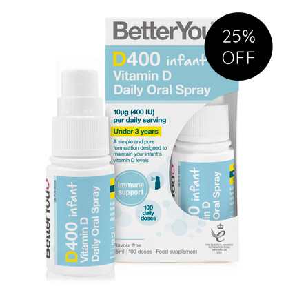 BetterYou D400 Infant Vitamin Daily Oral Spray delivers 400iu (10mcg) of bioavailable vitamin D3 in a convenient spray form. Vitamin D promotes the development and maintenance of bones and teeth, supports a healthy immune system and aids muscle development.