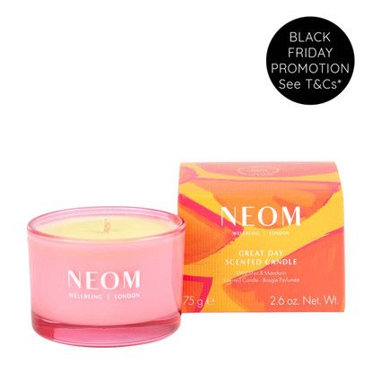 Brighten your day wherever you go with the Neom Wellbeing Great Day Candle, now available in a convenient travel size. Infused with 100% pure essential oils of wild mint and zesty mandarin, this uplifting Neom candle naturally boosts your mood and fills any space with a radiant, citrus-fresh aroma that awakens your senses and energises your surroundings.