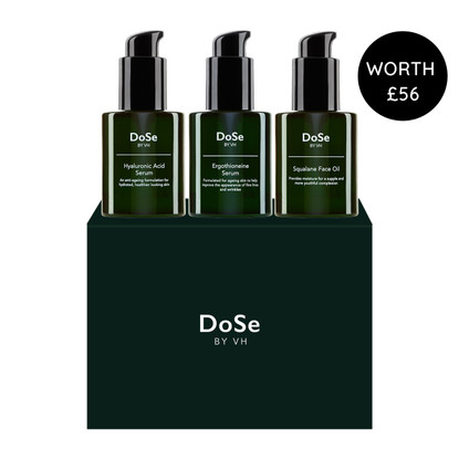 Give your skin the ultimate hydration boost and a radiant refresh with DoSe For Dry & Dehydrated Skin Collection. This powerful trio features Ergothioneine Serum, Hyaluronic Acid Serum, and 100% Squalane Face Oil that work together to restore moisture, strengthen your skin’s natural barrier, and protect against environmental damage and free radicals, leaving your skin soft, smooth, and beautifully radiant.
